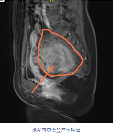 李女士很焦虑,经朋友介绍来到我院妇三科就诊,雷南香主任团队为患者进行仔细检查,经过三合诊,也就是经直肠、阴道、腹部联合检查,发现肿物位于子宫体中下段-宫颈后壁肌壁间/浆膜下,在阴道壁及直肠间,并向上延伸至骶前,边界清,大小约8.3×10.9×10.5cm,为盆腔腹膜后肿瘤,肿物被腹膜包裹,且被上方直肠乙状结肠遮盖,位置相当隐匿且罕见。