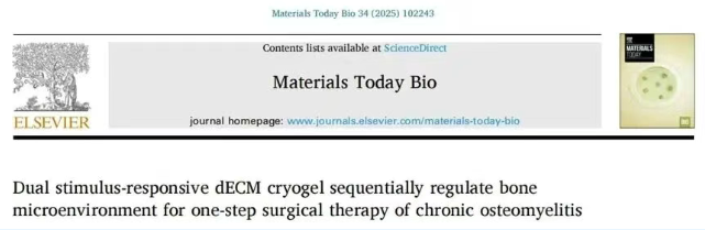 近日,梅州市人民医院运动医学科廖红兴主任团队在骨科疑难病症——慢性骨髓炎治疗方面取得重要科研突破,其原创研究成果,论文题为《Dual Stimulus-Responsive dECM Cryogel Sequentially Regulate Bone Microenvironment for One-Step Surgical Therapy of Chronic Osteomyelitis》的文章在国际知名期刊《Materials Today Bio》(中科院1区TOP,影响因子10.2)正式发表。