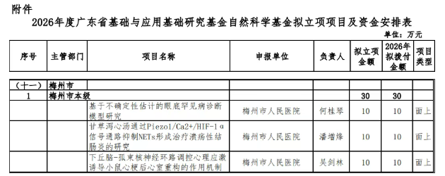 2025年11月11日,广东省基础与应用基础研究基金委员会正式公布了2026年度广东省基础与应用基础研究基金自然科学基金拟立项项目名单,梅州市人民医院潘增烽、吴剑林、何桂琴三位博士荣获项目资助!