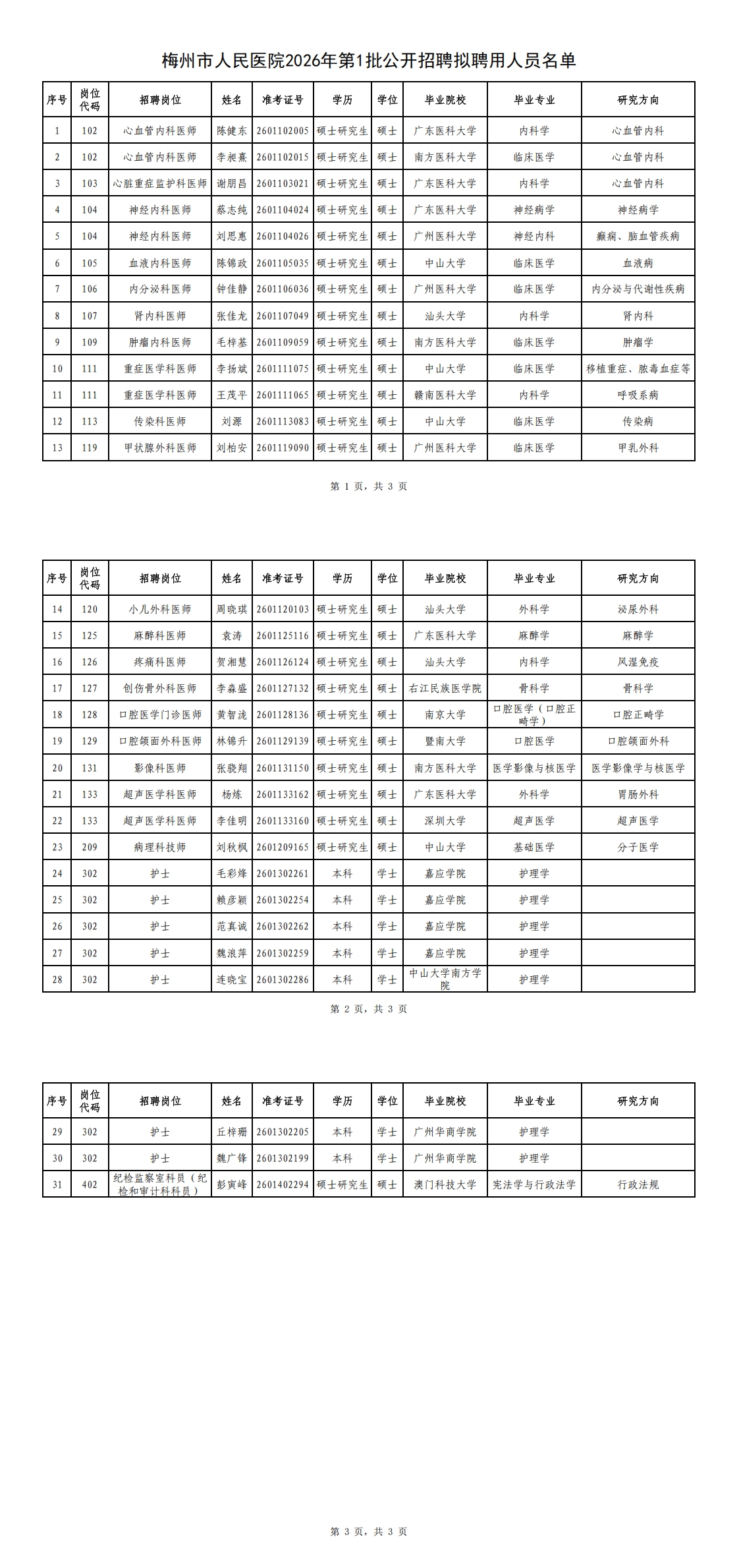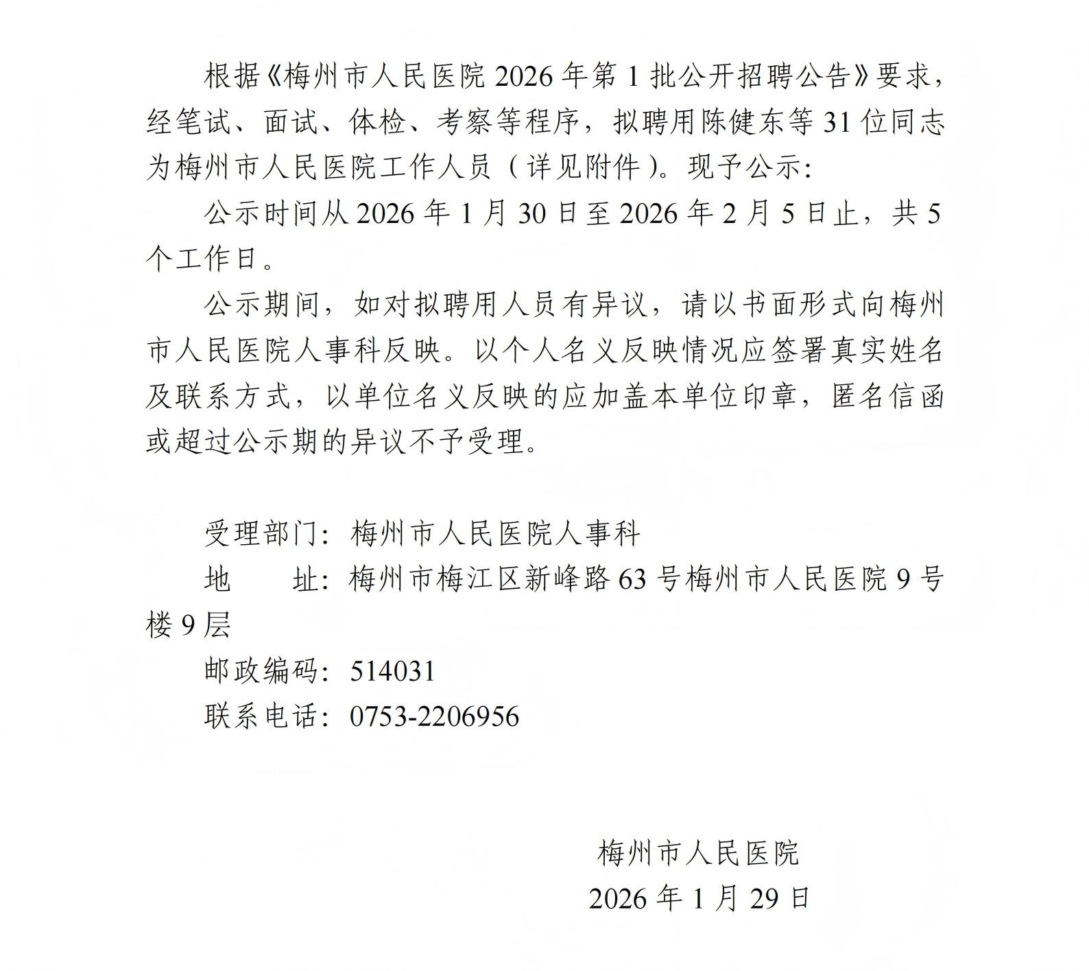 梅州市人民医院2026年第1批公开招聘拟聘用人员公示