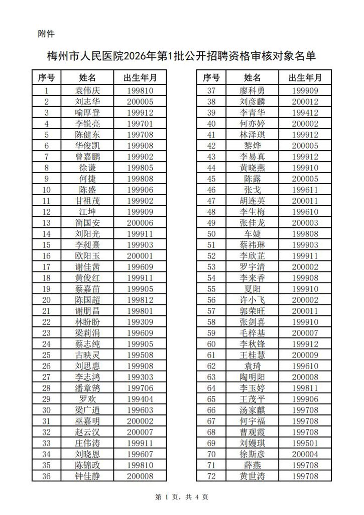详见《梅州市人民医院2026年第1批公开招聘资格审核对象名单》(附件)。